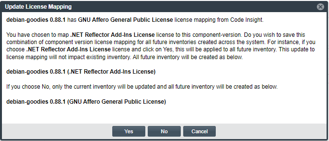 The Update License Mapping window provides the option to save your new license mapping at the system level so that all future inventory system-generated for the component version across projects will be associated with the license. The window also explains what happens when the mapping is save at the system level to help you make an informed decision.